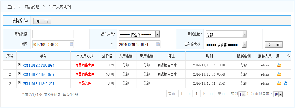 操作:雙擊訂單可以展開訂單詳情 可以打印小票,有的出入庫類型也可以撤單