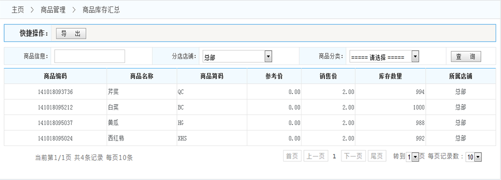 商品庫存匯總: 導(dǎo)出:可以將列表中的數(shù)據(jù)導(dǎo)出到Excel表格 篩選:可以根據(jù)編碼或者簡(jiǎn)碼或者名稱 快速找到某個(gè)商品 也可以根據(jù)店鋪或者商品分類查詢數(shù)據(jù) 列表:列出所有滿足條件的數(shù)據(jù)(默認(rèn)是顯示所有的數(shù)據(jù))