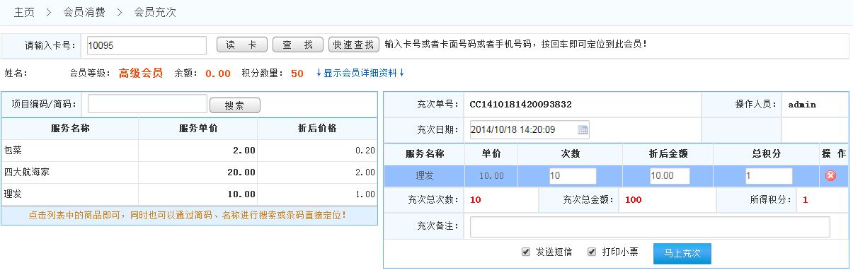 先會員刷卡定位到會員,然后輸入商品的名稱或簡碼或者掃描槍快速定位查找商品;或先會員刷卡,然后輸入充次項目編碼或簡碼查找服務項目;或者直接點擊服務項目;選擇服務項目后點擊結(jié)算此訂單如圖顯示: