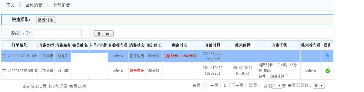 顯示:點擊菜單欄的計時消費,將進(jìn)入如下界面, 此頁面顯示的是計時消費的詳細(xì)列表